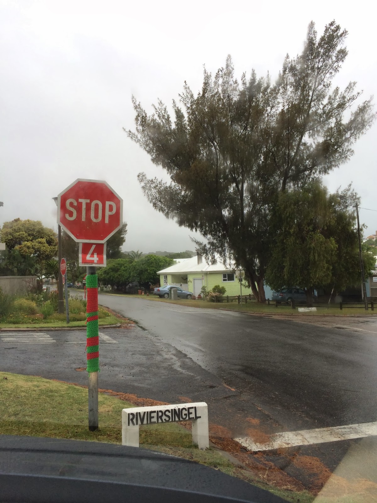 This flag bunting was designed by my friend Cornel and featured in the Idees magazine a year or so ago. The idea was to use it as tree decorations (the young karee outside our little beach house), but it also ended up as being used for little yarn bombs. I used Raeesah cotton, a DK yarn with the most beautiful, solid, clear colours, but spliiiiity, splitty, splitty. Very much the same as Drops Cotton Light that some UK/European bloggers complained about. My sis even abandoned her plans of joining and edging a baby blanket with it, and sent me the whole batch to try out/re-distribute. I kept one.